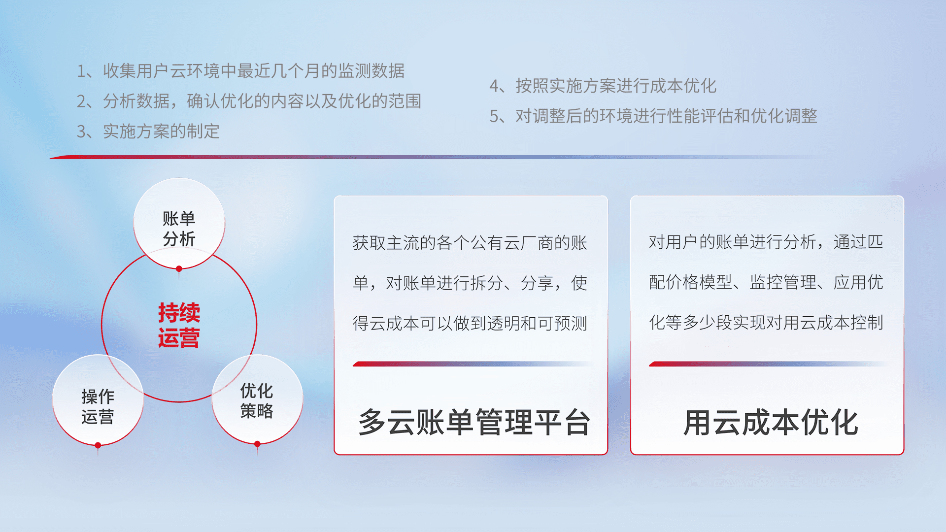 通过多云纳管,,,以统一的资源数据模型把客户的云资源进行抽象和封装,,,进而实现对多云资源的统一操作,,保障云资源管理的可靠性、、稳定性与可用性。。量身定制化运维内容,,配置、、、开发运维、、、、补丁管理、、备份、、监控、、认证和访问管理、、、、审计和日常巡检等,,保障在用云过程中的可靠度,,稳定度以及高可用率。。。。