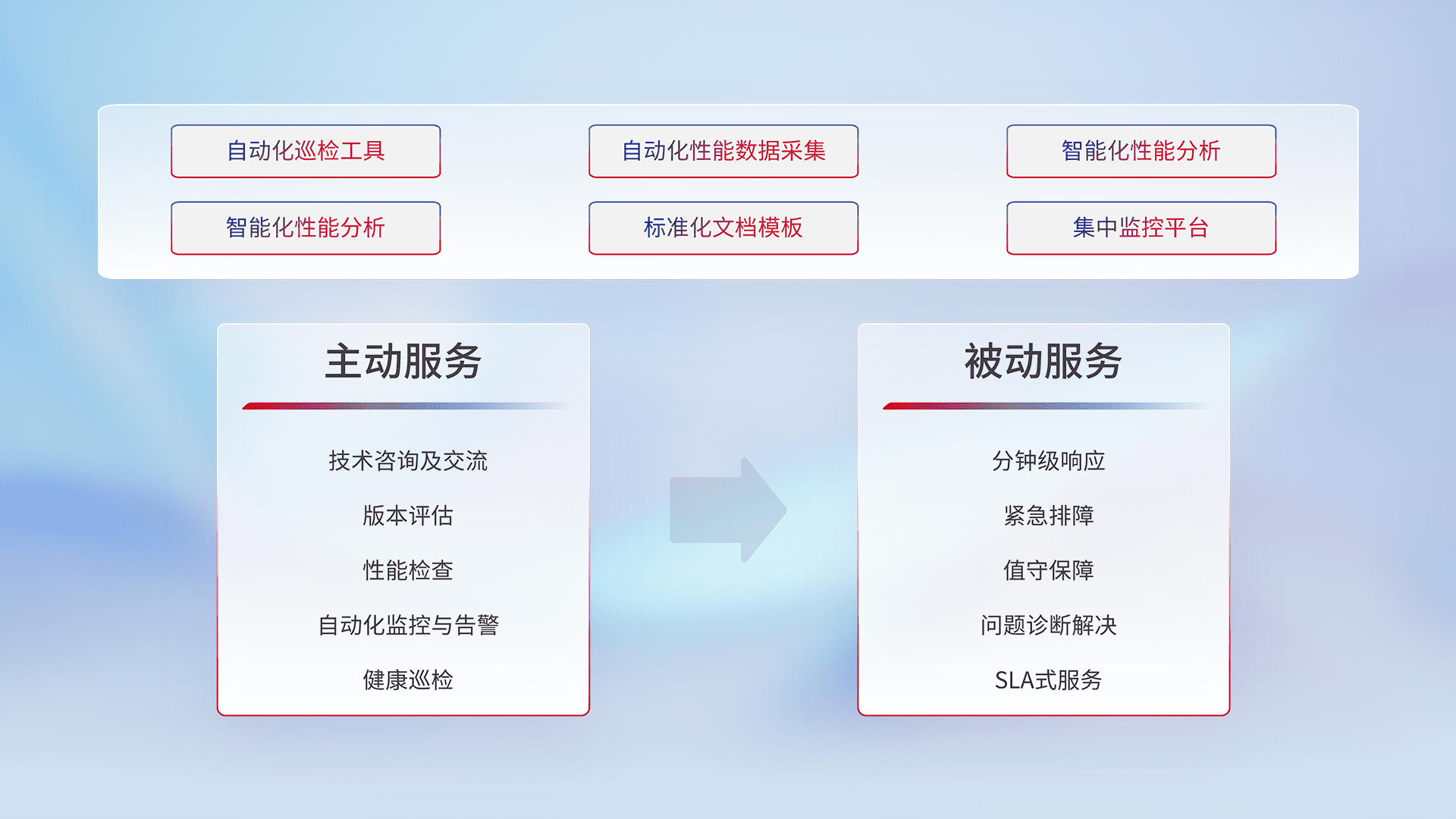智能化工具和标准化文档,,,保障服务质量,,提供主动服务(包含技术咨询、、、、版本评估、、性能检查、、自动化监控与告警、、、、健康巡检)和被动服务包含(分钟级响应、、、、紧急排障、、、、值守保障、、、、问题诊断解决、、SLA服务)。。。